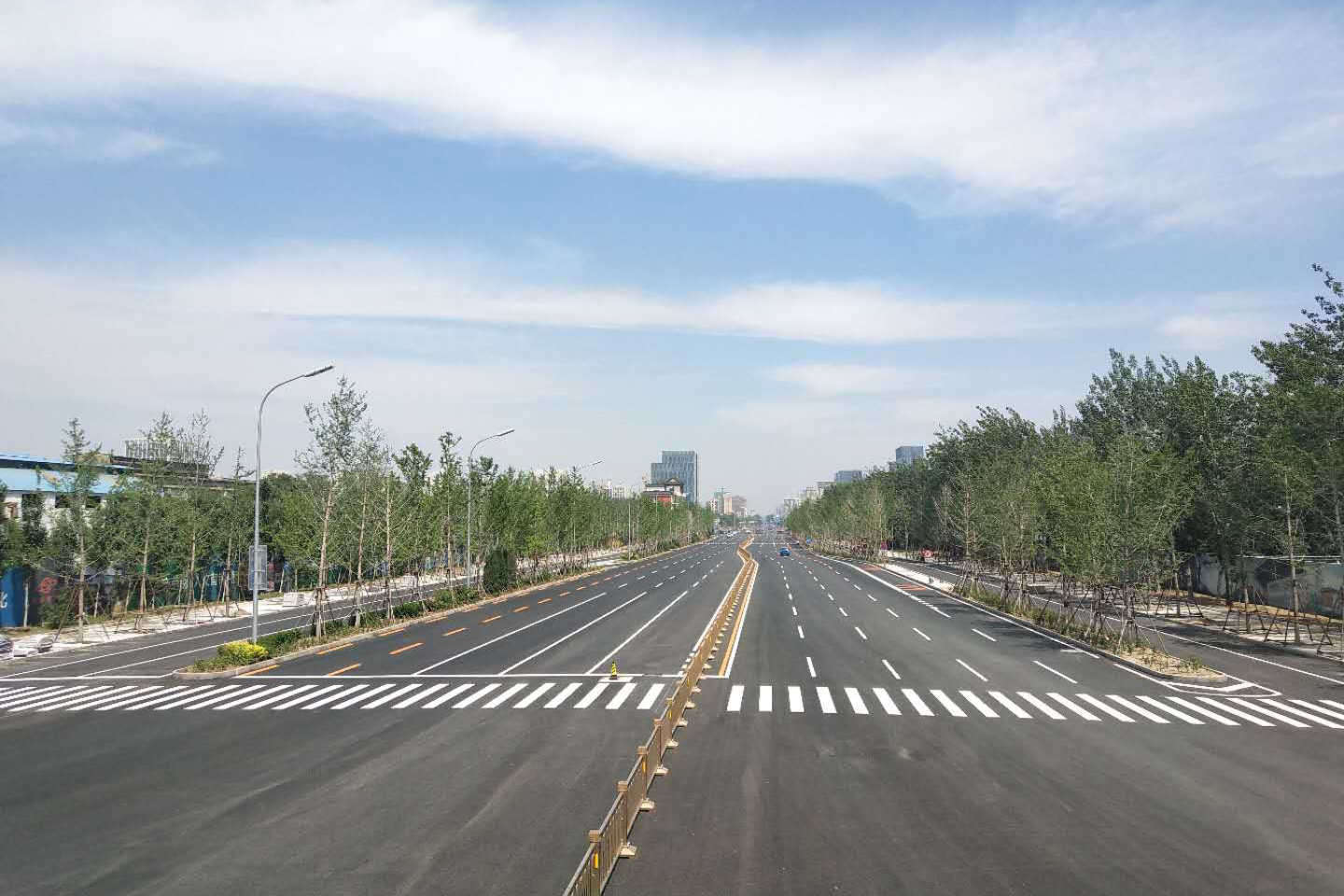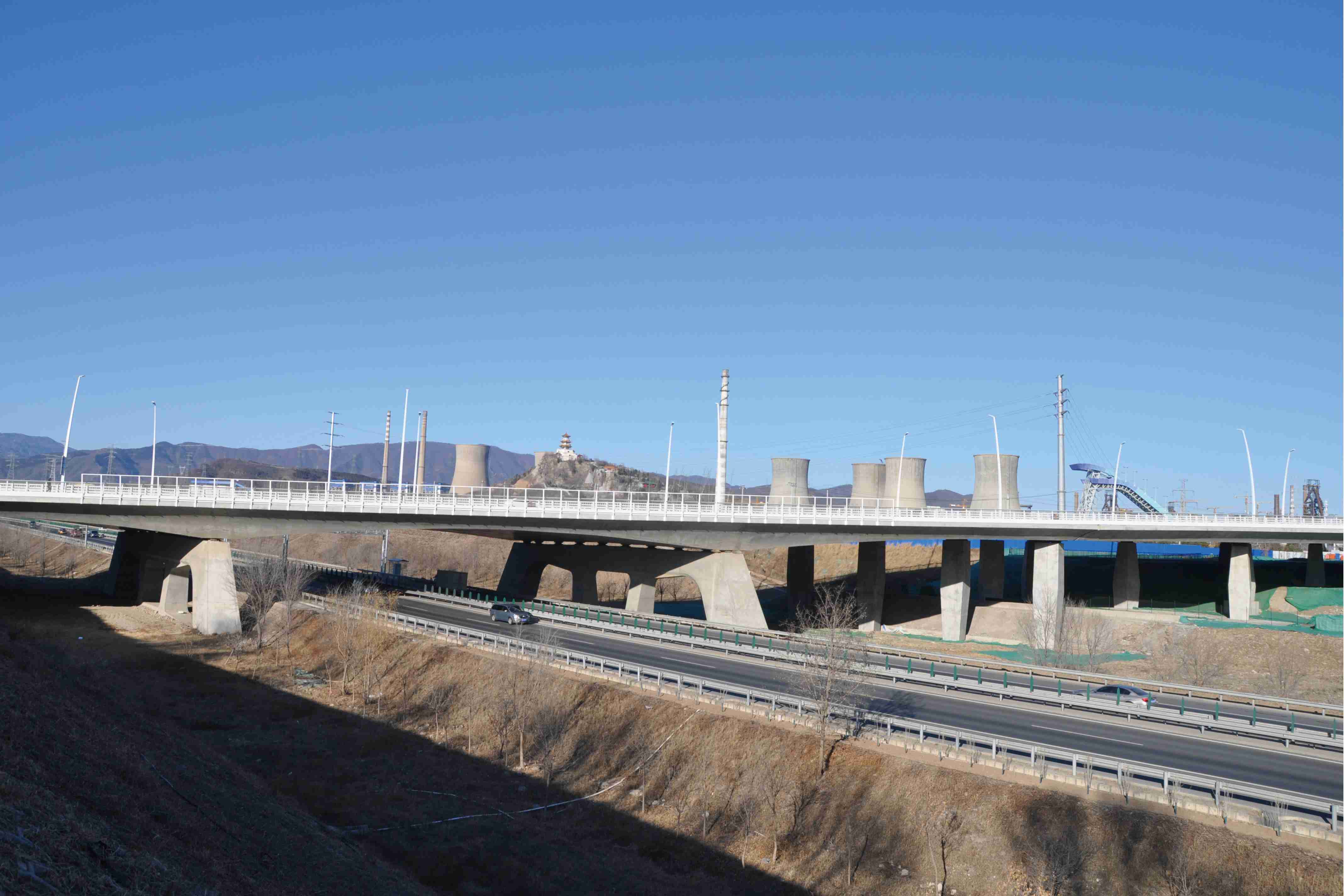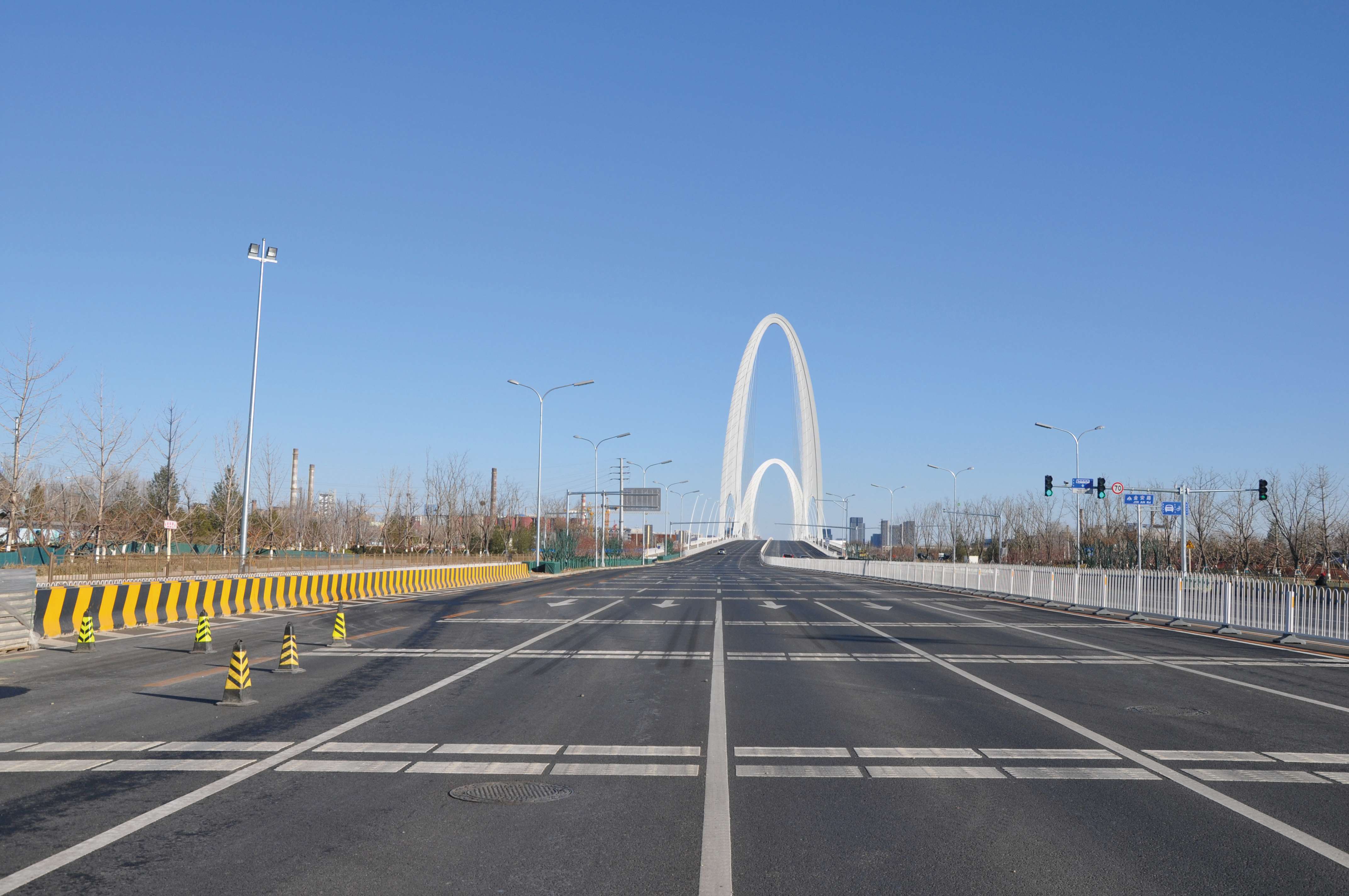 長安街西延線工程東起石景山區(qū)古城大街,向西經(jīng)首鋼主廠區(qū)、上跨豐沙鐵路、永定河及六環(huán)路至門頭溝區(qū)三石路,全長約6.4公里。長安街西延工程道路標(biāo)準(zhǔn)為城市主干路,紅線寬60至100米,古城大街至六環(huán)路西側(cè)路安排4上4下8條機(jī)動車道,包括外側(cè)兩條公交專用車道,六環(huán)路西側(cè)路至三石路為包含兩條公交專用道的3上3下6條機(jī)動車道。長安街西延道路橫跨永定河,新建跨永定河特大橋一座。長安街西延道路的輔路系統(tǒng)及雨水、綠化、照明、交通工程、環(huán)保、工程改移等工程同步實施。長安街西延跨永定河大橋景觀性標(biāo)志建筑——雙塔斜拉和剛構(gòu)組合體系橋“和力之門”,橋梁全長1230米,斷面寬度47米,橋梁總面積5.82萬平方米。